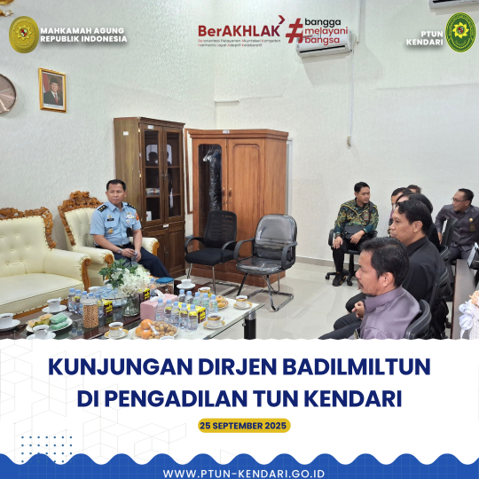 Pada hari Kamis, tanggal 25 September 2025. PTUN Kendari menerima Kunjungan Bapak Direktur Jenderal Badan Peradilan Militer dan Peradilan Tata Usaha Negara Marsekal Muda TNI DR. Yuwono Agung Nugroho, S.H., M.H. Beserta rombongan di PTUN Kendari. Kedatangan beliau disambut hangat oleh Ketua PTUN Kendari, Wakil Ketua, segenap Hakim, beserta seluruh Aparatur PTUN Kendari.