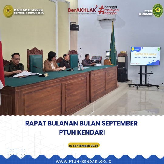 Pada hari Selasa, tanggal 30 September 2025. Telah dilaksanakan Rapat Bulanan Bulan September tahun 2025. Dalam rapat ini dipimpin oleh Ketua PTUN Kendari Ibu Rialam Sihite, S.H., M.H. dan diikuti oleh Wakil Ketua, Segenap Hakim, Panitera, Sekretaris, Pejabat Struktural, Pejabat Fungsional, serta seluruh Aparatur PTUN Kendari.