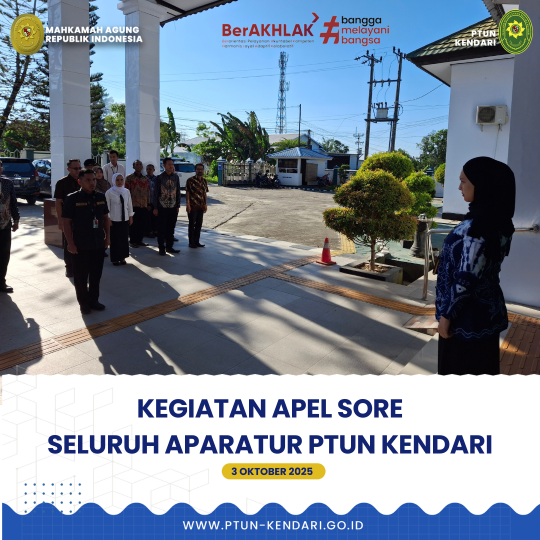 Pada hari Jum’at, tanggal 3 Oktober 2025. Bertempat di kantor Pengadilan Tata Usaha Negara Kendari telah dilaksanakan rangkaian kegiatan “Apel Sore”. Adapun Pembina Apel Sore adalah Hakim PTUN Kendari ibu Kevin Anjati Putri, S.H.