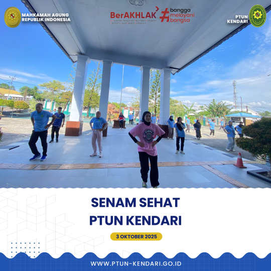 Pada hari Jum’at tanggal 3 Oktober 2025. Telah dilaksanakan Senam Sehat PTUN Kendari. Kegiatan ini diikuti oleh seluruh Aparatur PTUN Kendari.