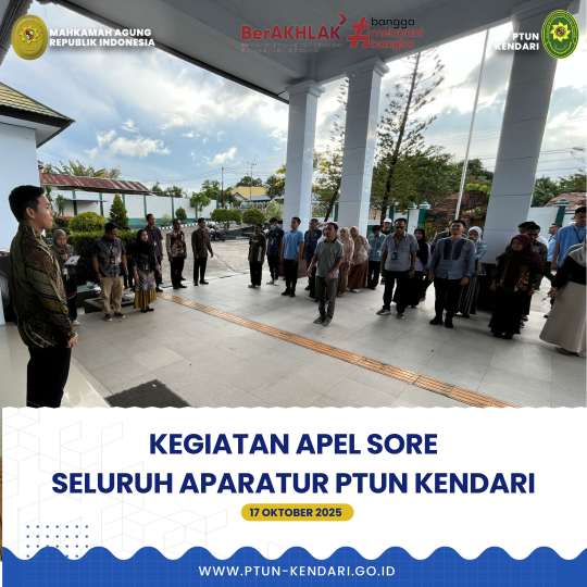 Pada hari Jum’at, tanggal 17 Oktober 2025. Bertempat di kantor Pengadilan Tata Usaha Negara Kendari telah dilaksanakan rangkaian kegiatan “Apel Sore”. Adapun Pembina Apel Sore adalah Hakim PTUN Kendari bapak Nicko Antonio Wijaya, S.H.