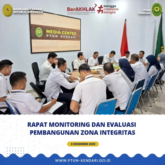 Pada hari Senin, tanggal 8 Desember 2025. Telah dilaksanakan Rapat Monitoring dan Evaluasi Pembangunan Zona Integritas PTUN Kendari. Dalam rapat ini dipimpin oleh Bapak Andri Nugroho Eko Setiawan, S.H. (Ketua Tim ZI) dan diikuti oleh Segenap Hakim (Koordinator Area), Panitera (Sekretaris tim I), Sekretaris (Sekretaris tim II) ,Segenap Panitera Muda(Ketua area) , Segenap Kasubag (Ketua area), beserta Analisis Keuangan APBN Ahli Muda (Ketua Area).