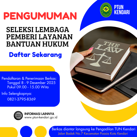 • Bagi Para Lembaga Hukum yang telah melakukan pendaftaran pada tanggal tertera diatas, diharap hadir pada hari Rabu tanggal 10 Desember 2025 untuk melaksanakan uji kompetensi di Pengadilan Tata Usaha Negara Kendari.