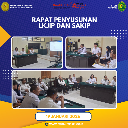 Pada hari Senin, tanggal 19 Januari 2026. Telah dilaksanakan Rapat Penyusunan LKJIP dan SAKIP PTUN Kendari. Dalam rapat ini dipimpin oleh Ketua PTUN Kendari dan diikuti oleh Wakil Ketua, Hakim, Panitera, Sekretaris, Panitera Muda, Kasubag dan staff bagian PTIP.