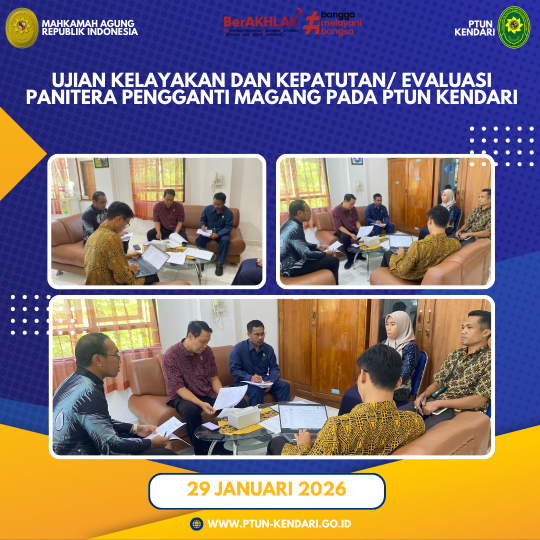 Pada hari Kamis, tanggal 29 Januari 2026. Telah dilaksanakan Ujian Kelayakan Dan Kepatutan/Evaluasi Panitera Pengganti Magang Pada PTUN Kendari. Kegiatan ini dipimpin oleh Wakil Ketua PTUN Kendari dan diikuti oleh Panitera, Segenap Hakim , dan Panitera Pengganti Magang PTUN Kendari