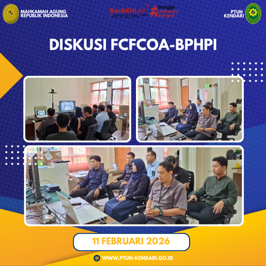 Pada hari Rabu, tanggal 11 Februari 2026. Wakil Ketua PTUN Kendari bersama segenap Hakim, mengikuti kegiatan Diskusi FCFCOA-BPHPI yang diselenggarakan secara hybrid oleh Badan Perhimpunan Hakim Perempuan Indonesia dengan Federal Circuit and Family Court of Australia (FCFCOA).