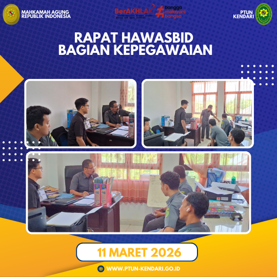 Pada hari Rabu, tanggal 11 Maret 2026. Telah dilaksanakan Rapat Hawasbid Bagian Kepegawaian PTUN Kendari. Dalam rapat ini dipimpin oleh Bapak Rizki Mubarok , S.H., M.H. (Hakim) dan diikuti oleh Kasub Kepegawaian beserta staff Kepegawaian