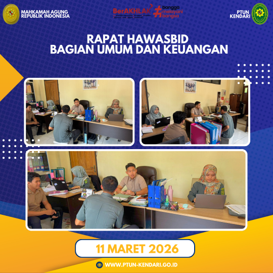 Pada hari Rabu, tanggal 11 Maret 2026. Telah dilaksanakan Rapat Hawasbid Bagian Umum dan Keuangan PTUN Kendari. Dalam rapat ini dipimpin oleh Bapak Nicko Antonio Wijaya, S.H. (Hakim) bersama Bapak Falih Fadli, S.H., M.H. (Hakim) dan diikuti oleh Kasub Umum dan Keuangan beserta staff bagian Umum dan Keuangan.