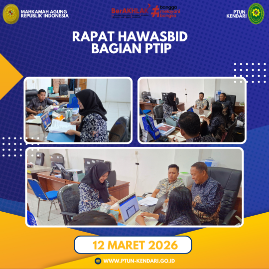 Pada hari Rabu, tanggal 12 Maret 2026. Telah dilaksanakan Rapat Hawasbid Bagian PTIP PTUN Kendari. Dalam rapat ini dipimpin oleh Ibu Desi Arianing Arrum, S.H., M.H. (Hakim) dan diikuti oleh PTIP beserta staff bagian PTIP.