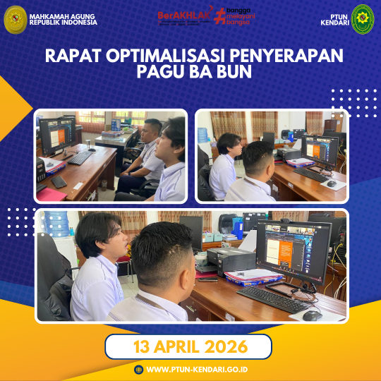 Pada hari Senin, tanggal 13 April 2026. PTUN Kendari mengikuti Rapat Optimalisasi Penyerapan Pagu BA BUN secara daring. Kegiatan ini diikuti oleh segenap staff PTIP PTUN Kendari.