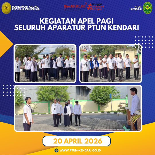 Pada hari Senin, tanggal 20 April 2026. Bertempat di kantor Pengadilan Tata Usaha Negara Kendari telah dilaksanakan rangkaian kegiatan “Apel Pagi”. Adapun Pembina Apel Pagi adalah Hakim PTUN Kendari Bapak Falih Fadli, S.H., M.H. (Hakim)